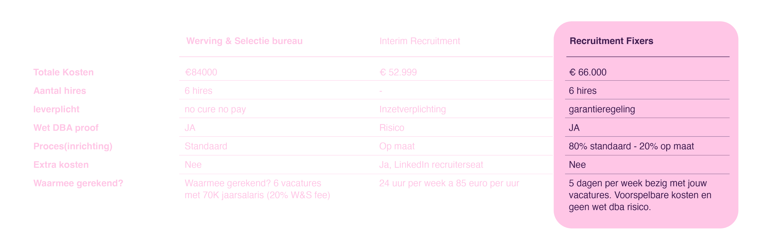 Met Solid Fix krijg je de dienstverlening van een interim recruiter (wet DBA proof) en ben je voordeliger uit dan werven via een bureau. Bij 6 tot 10 vacatures per jaar is dit een goede keuze.